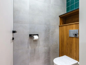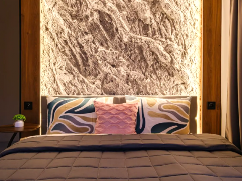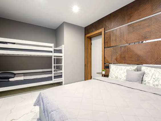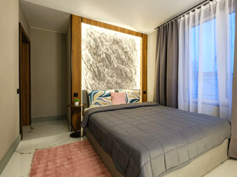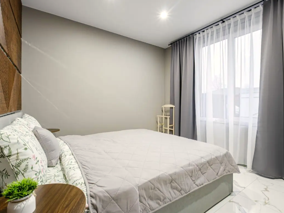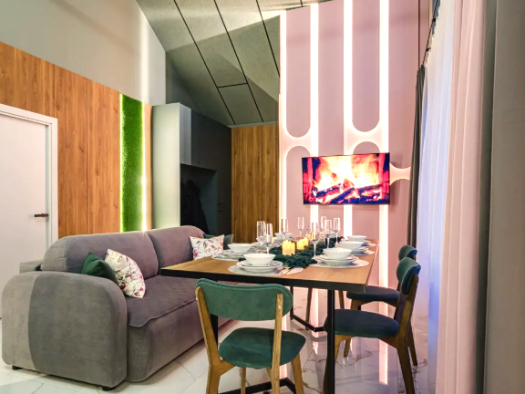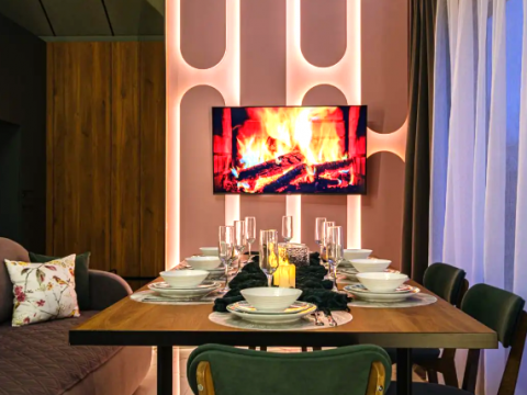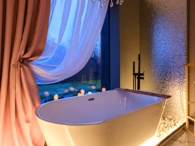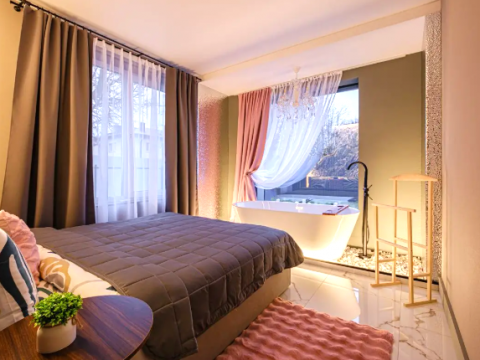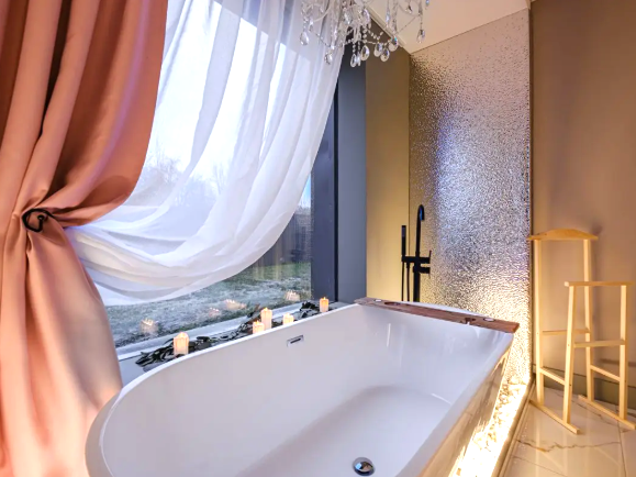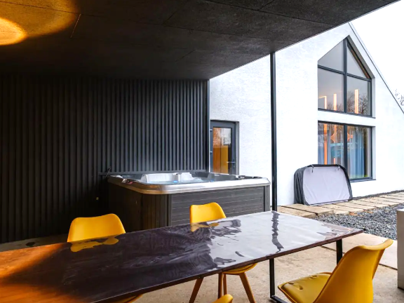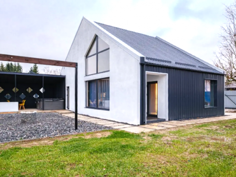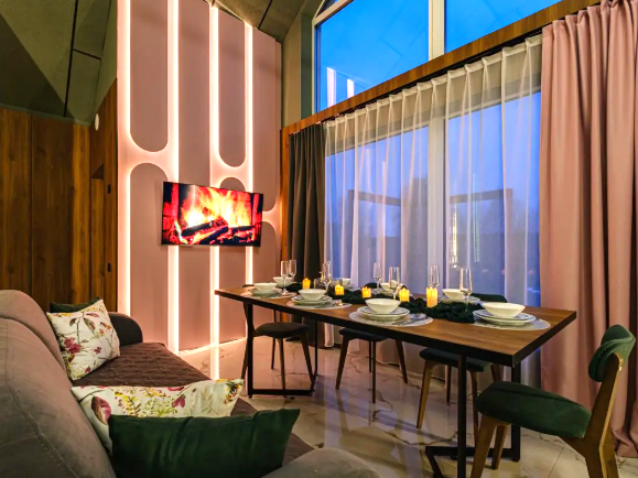В доме 2 спальни, в одной из них установлена ванна - шикарное место для релакса. В доме оборудован санузел. В гостиной у французского окна в пол установлен просторный стол с мягким диваном и удобными стульями.