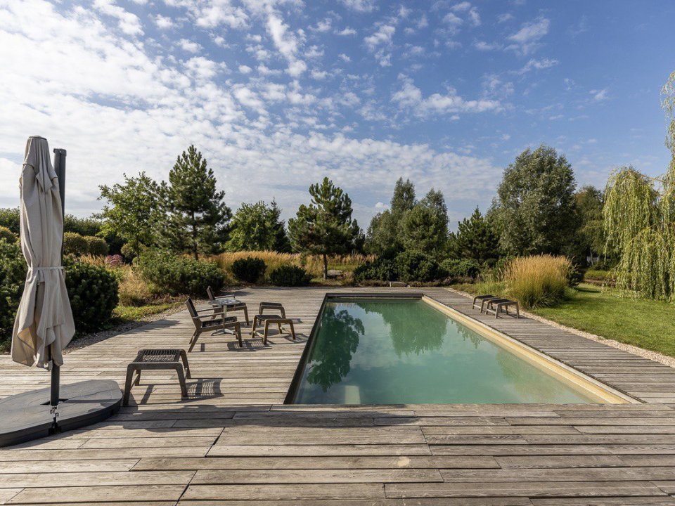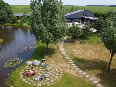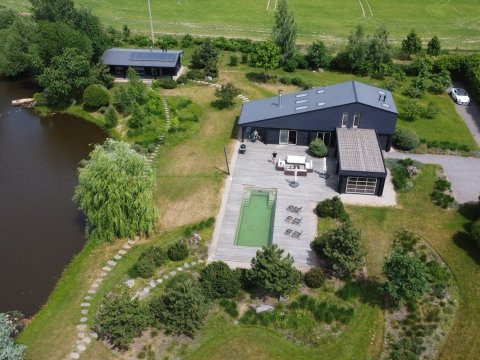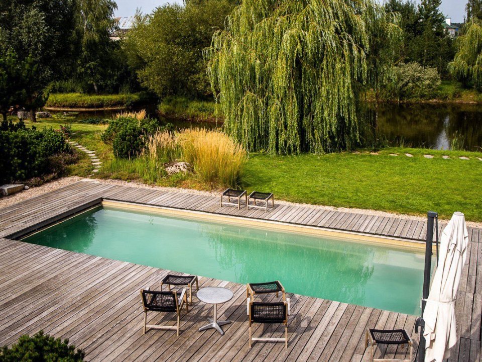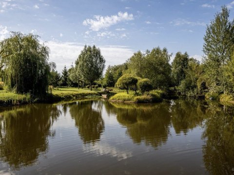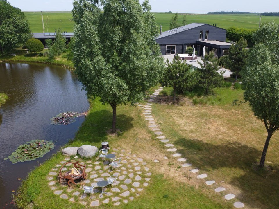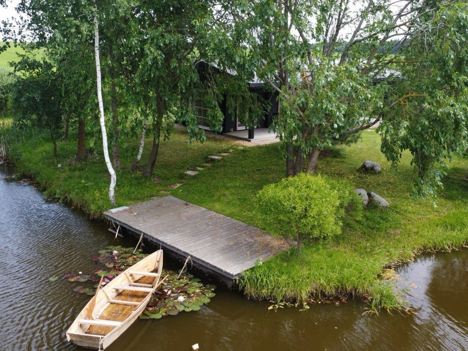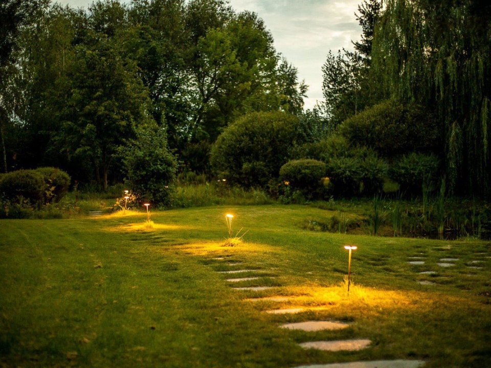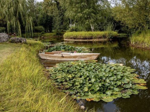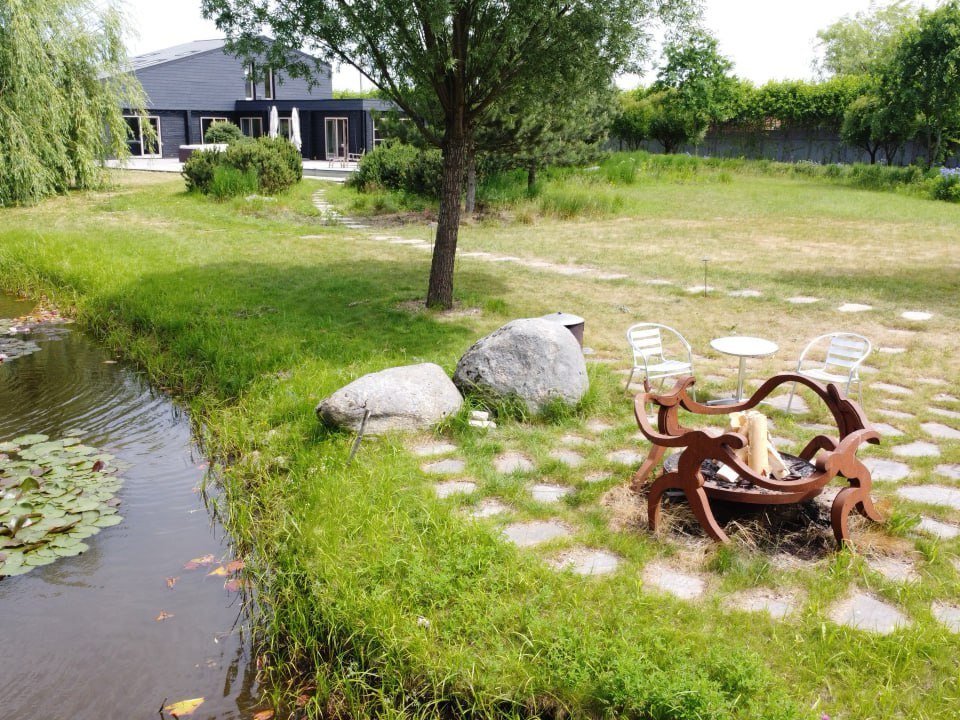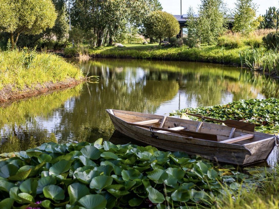 Имеется собственный водоём-озеро с двумя островками и лодкой. Вас поразит уникальный ландшафт под названием "Дыхание ветра" (победитель конкурса «Лучший реализованный проект сада»), от дикого леса до газона, от цветников с более 70 видов трав и цветов до состаренных камней-валунов, поросших мхом, разложенных на территории в 1 гектар,