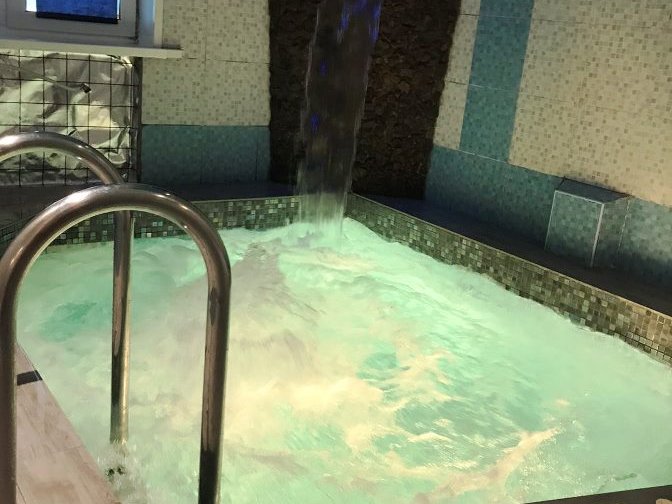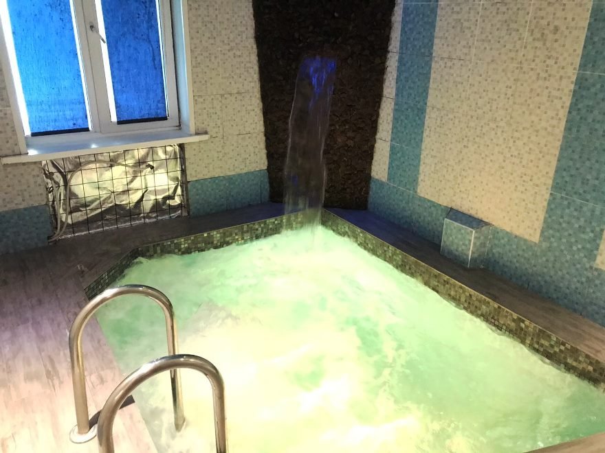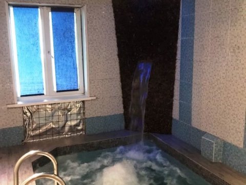 На первом этаже также располагается сауна. Отличная русская баня на дровах порадует вас своим паром, бассейном с водопадом и современными душевыми кабинами. Комната отдыха в бане оборудована камином, спутниковым телевидением и музыкальной аппаратурой.