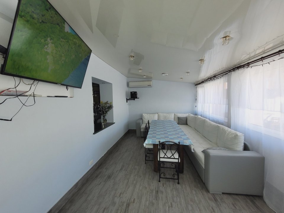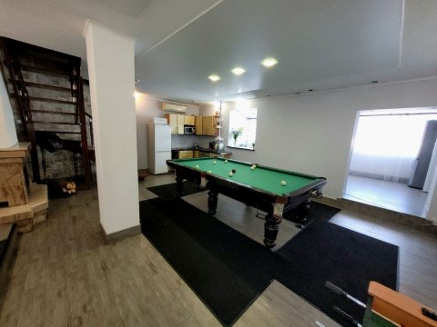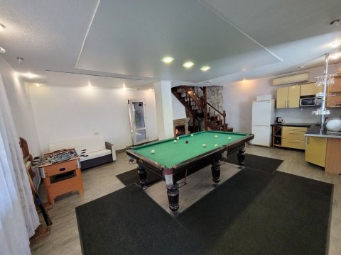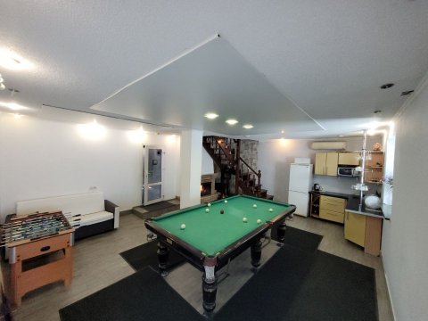 К вашим услугам на первом этаже просторный зал с огромным столом и мягким угловым диваном, оборудованный кальянной зоной. Также в вашем распоряжении гостиная-студия с прекрасной мебелью, импортной бытовой техникой и столовой посудой. Имеется домашний кинотеатр и спутниковое телевидение, музыкальная аппаратура, DVD, караоке.