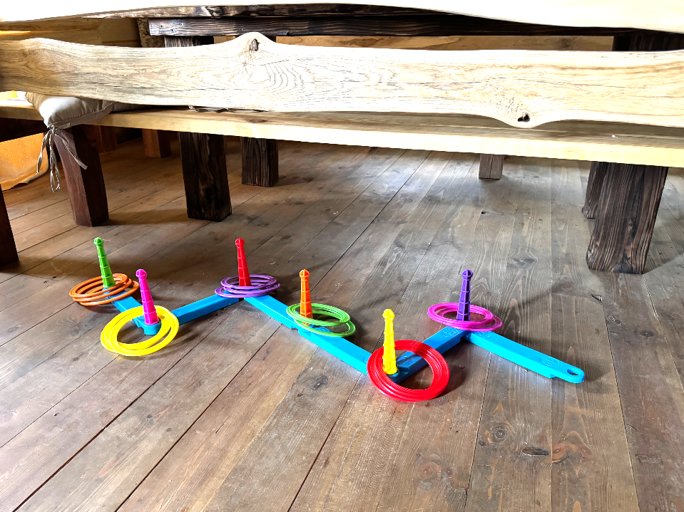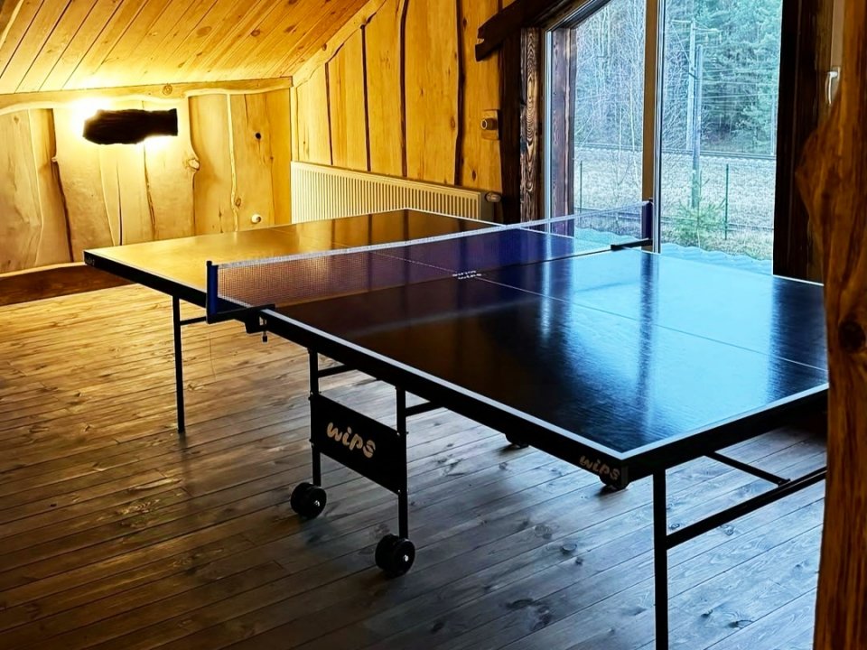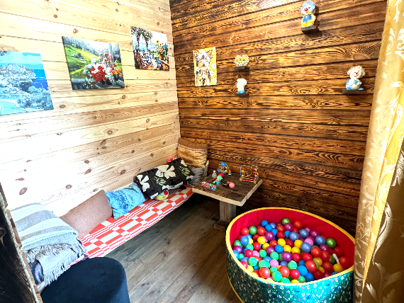 Помимо основных залов, в коттедже имеется детская комната с разнообразными развлечениями: батут, настольные игры, песочница, сухой бассейн с шариками, дротиковый тир, баскетбольное кольцо и раскраски.