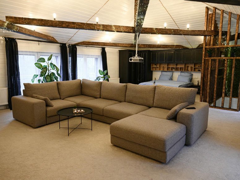 На первом этаже дома уютно расположилась просторная кухня, совмещенная с гостиной. Здесь же вас порадуют баня в формате хамама, бассейн, душ, туалет и выход на террасу с оборудованной зоной для барбекю.
