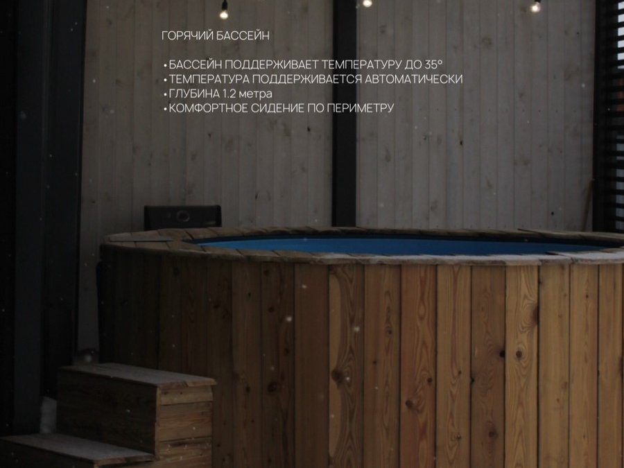 В вашем распоряжении электро-сауна, бассейн с подогревом 35 градусов, который горячий постоянно, гостям греть его не нужно.
