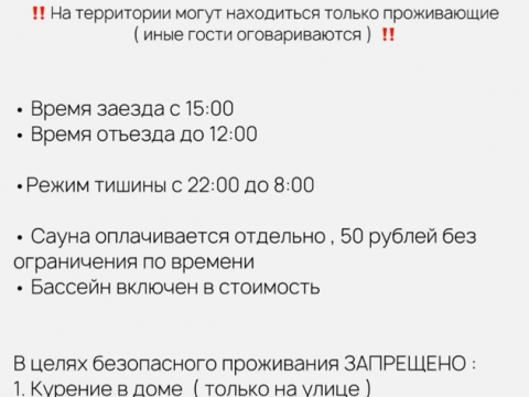| Цена за баню (сауну): | СУББОТА - включена в стоимость. ОСТАЛЬНЫЕ ДНИ - 100 рублей за 5 часов ( С 17.00 ДО 22.00),, фурако входит в стоимость аренды. |