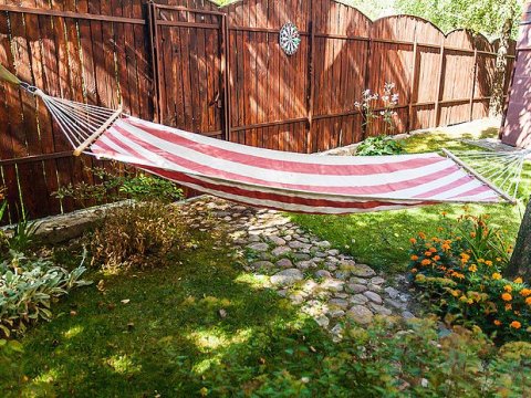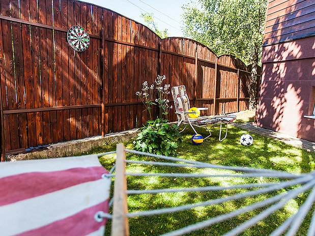 Не забыли мы и о наших маленьких гостях - для них на участке размещена детская площадка с песочницей и садовыми качелями.