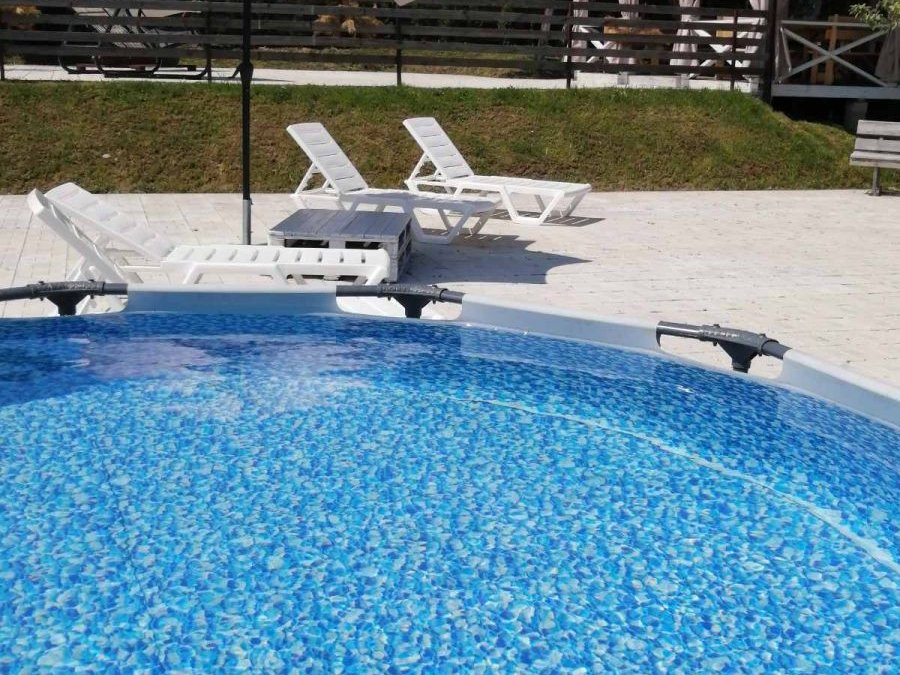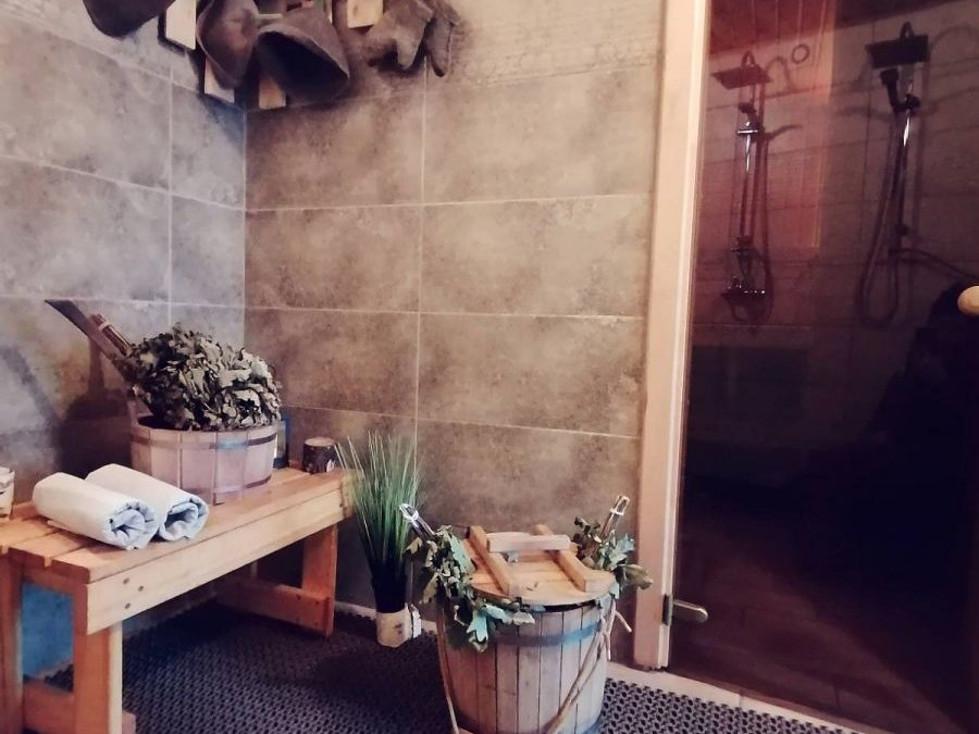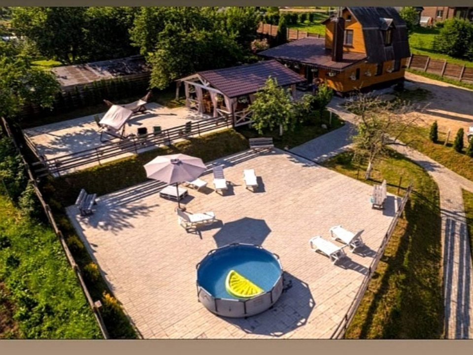 Настоящая сельская банька с солью и дубовыми вениками или сухим финским паром с открытым сезонным каркасным бассейном для окунания после парения, террасой для отдыха, беседкой и отдельной мангальной зоной