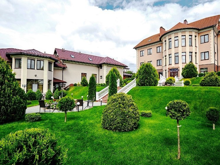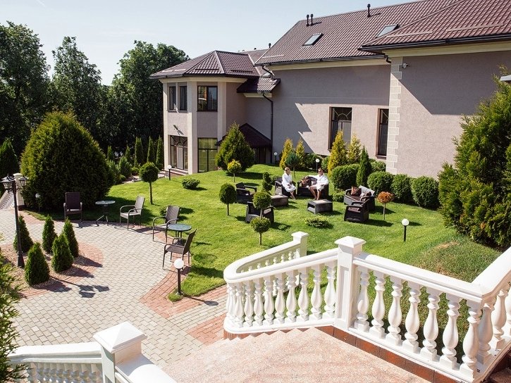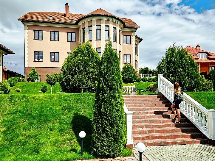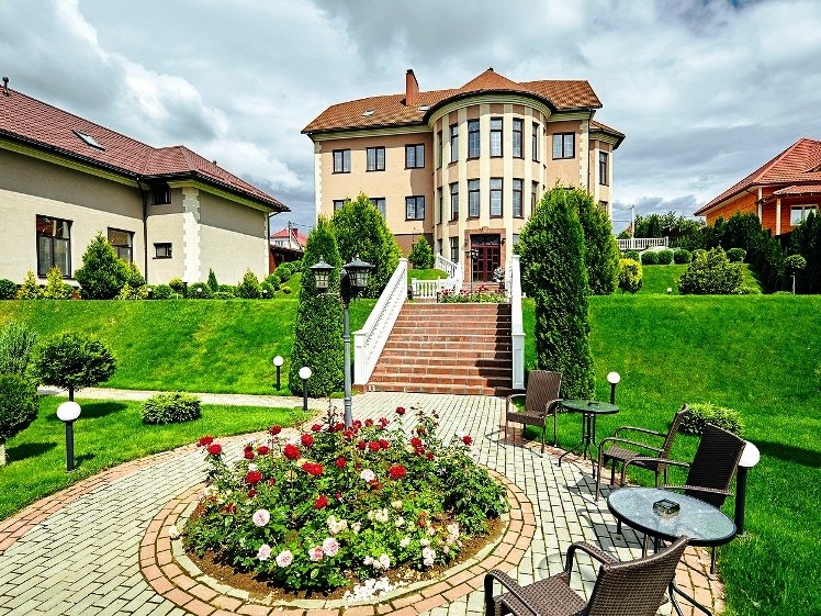 прекрасным панорамным видом. Территория просторна и ухожена, украшена стройными туями и розарием,