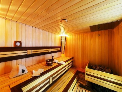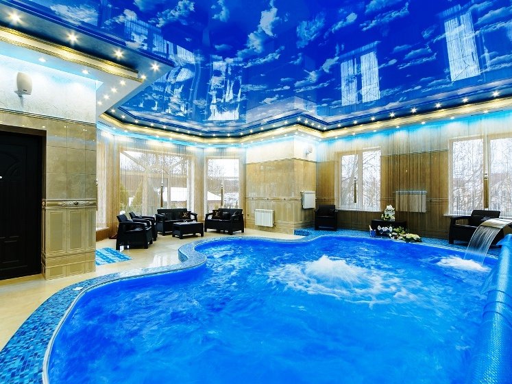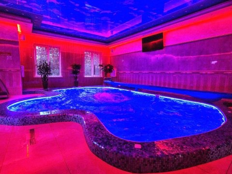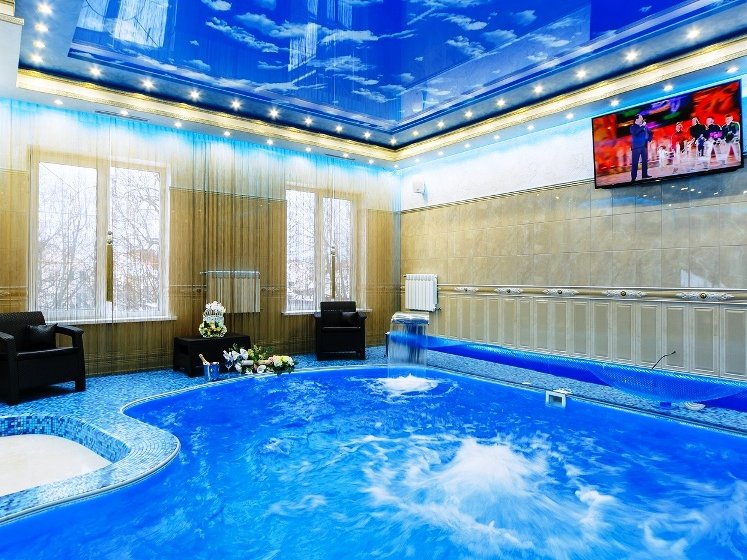 гости могут воспользоваться бассейном и сауной. Бассейн оснащен панорамными окнами, разнообразной подсветкой, внутри —