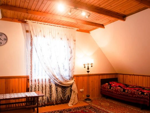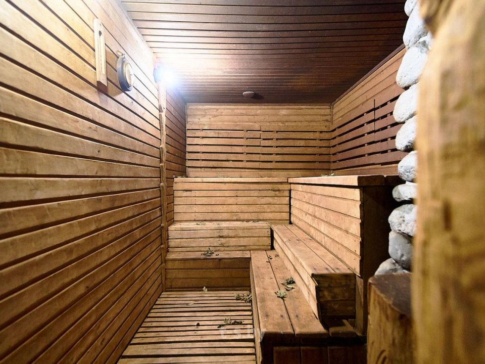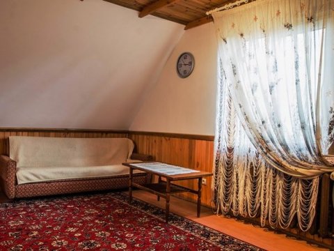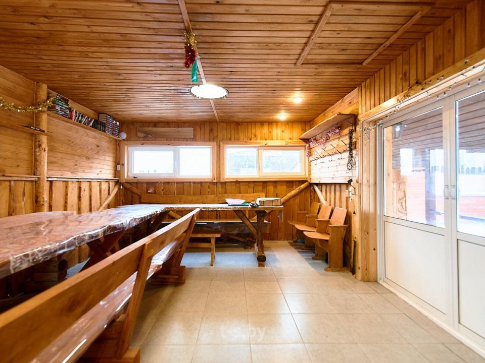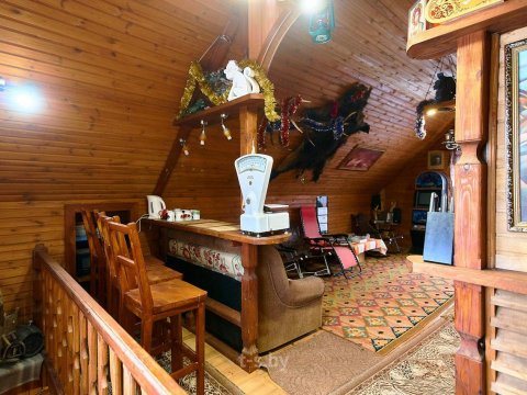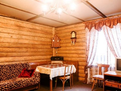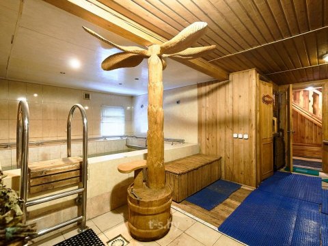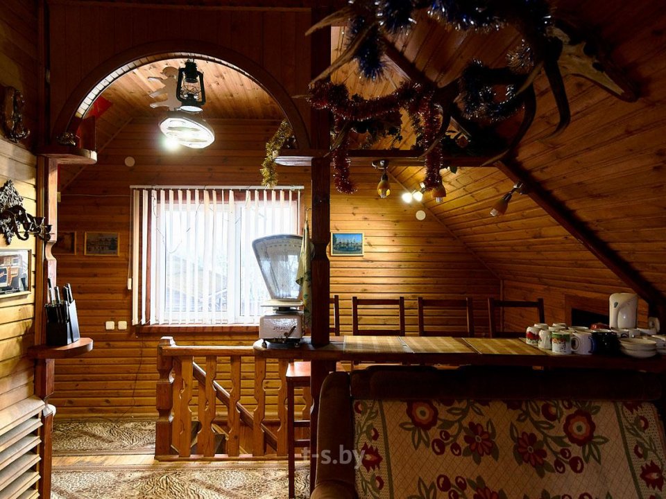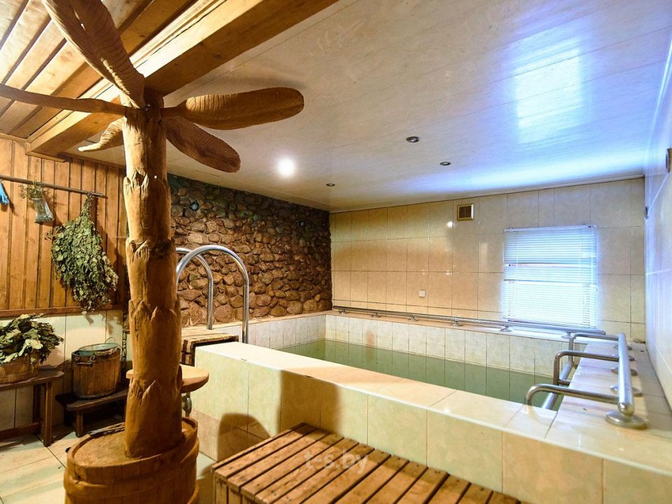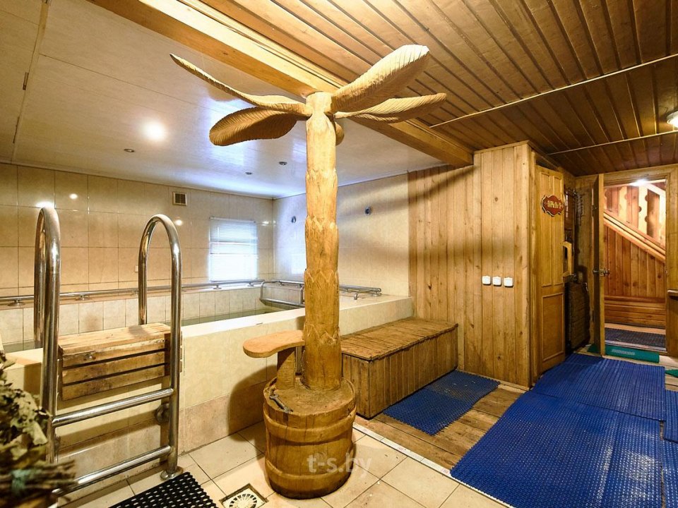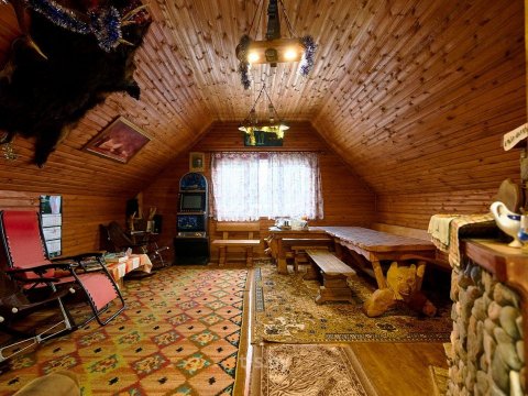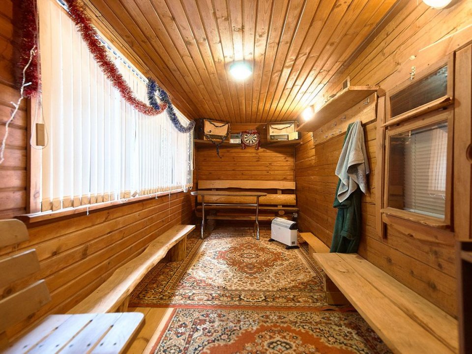 На втором — вместительная комната отдыха с удобной мебелью, телевизором, холодильником, микроволновкой и необходимой посудой. Вместимость бани до 10-ти человек одновременно. Стоит заметить, что её можно арендовать отдельно от усадьбы, минимальное время аренды 3 часа. Банщик, который по совместительству является и отменным поваром, поможет вам в приготовлении любимых блюд. Заказать ужин можно также в расположенном неподалёку кафе.