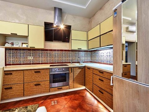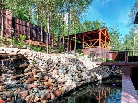 Оборудована открытая терраса с барбекю и казаном для приготовления плова на костре, а также деревянная беседка с мангалом и большим столом. Есть красивый декоративный прудик с водопадом, фонари и аккуратные стриженые газоны радуют глаз.