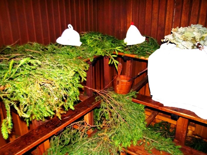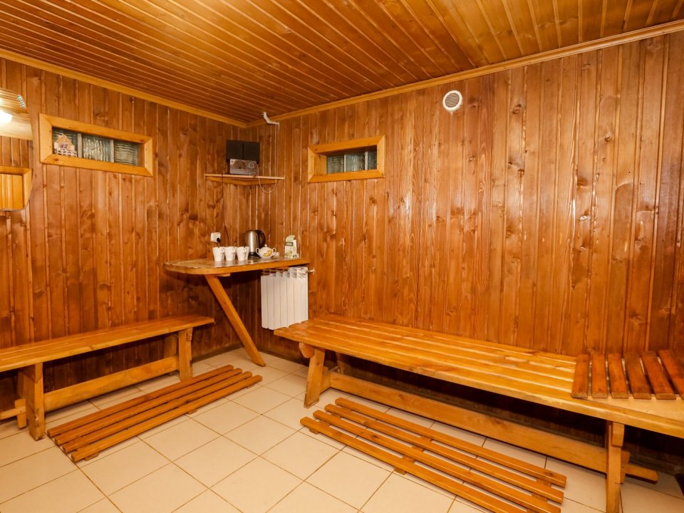 Первый этаж для любителей горячего пара занимает баня на дровах с бассейном и комнатой отдыха с 4-мя спальными местами. Все банные принадлежности, такие как: веники, шапочки, сидушки и простыни, чай, включены в стоимость бани. Одновременно в парилке могут разместиться до 6-ти человек.
