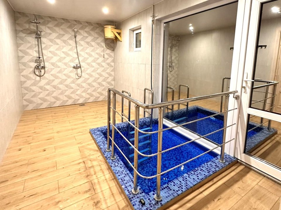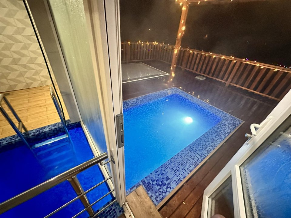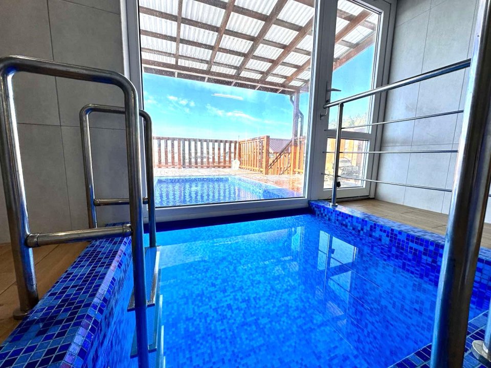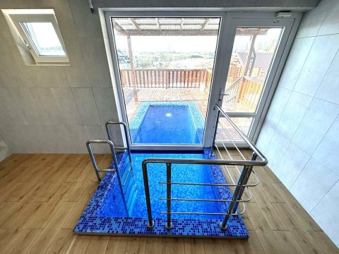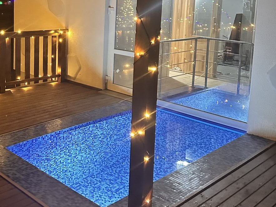 Удивит наш необычный бассейн с подогревом - он распределён между домом и улицей. Занырнув в него из помещения, вынырнуть можно уже на улице.