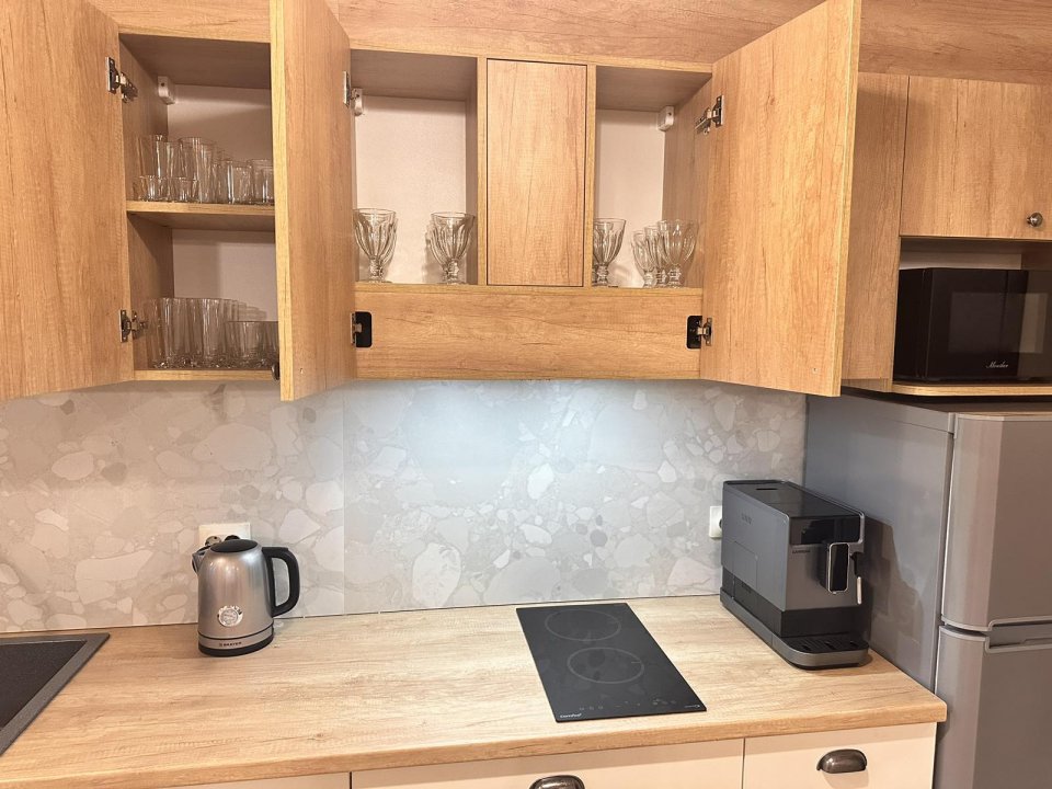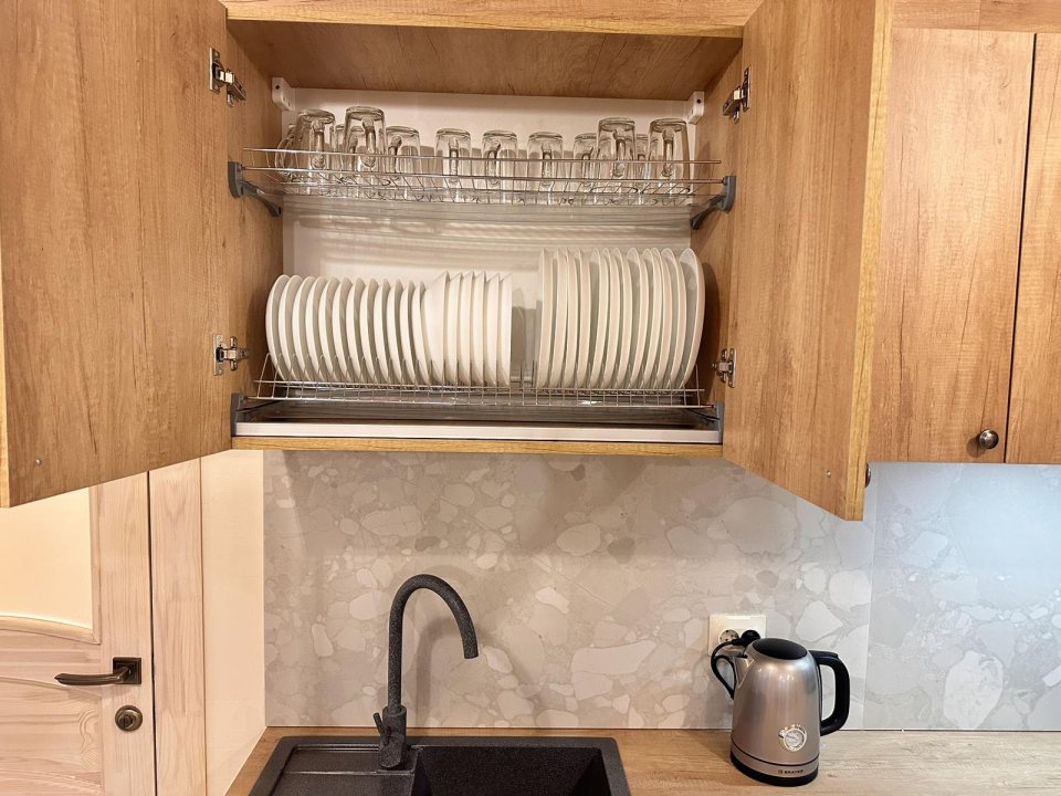 На кухне имеется вся необходимая посуда и техника ( включая кофемашину и микроволновку).