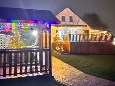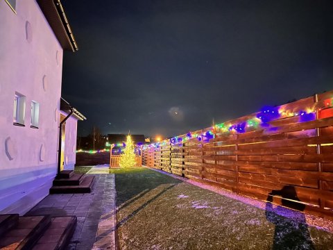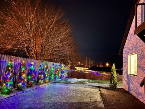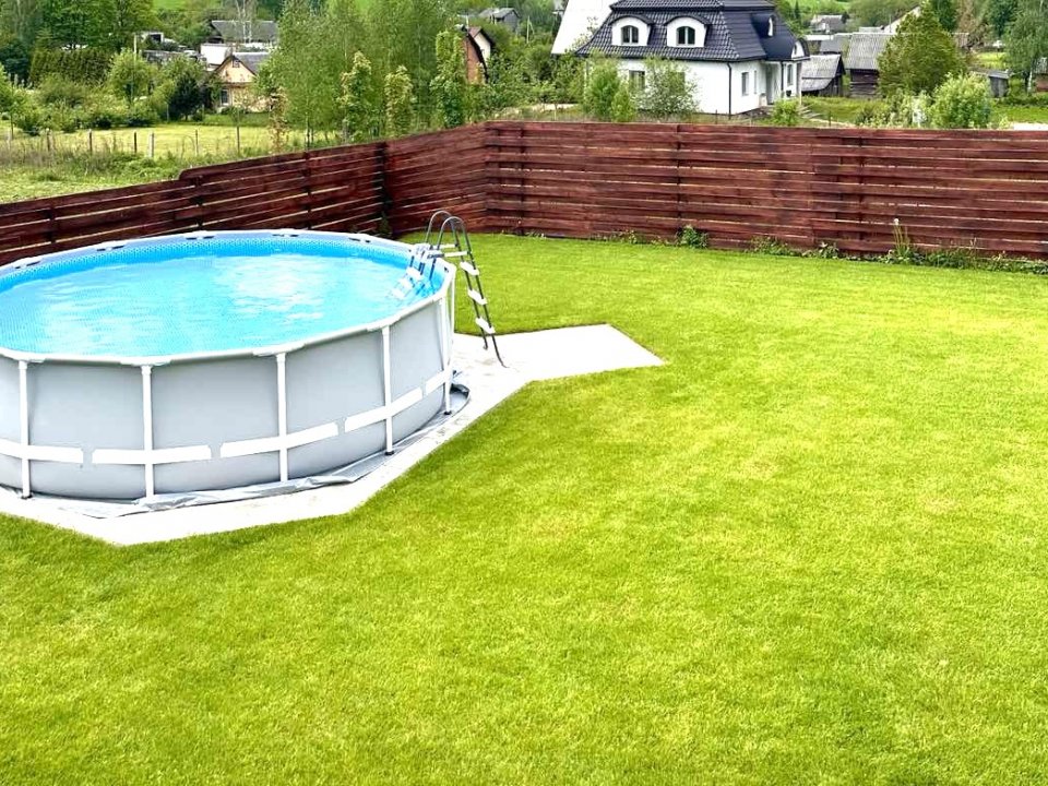 На огороженной территории с вечнозелёными насаждениями есть беседка. В летний период устанавливается каркасный бассейн.