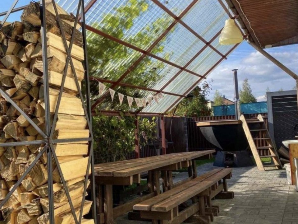 3 отдельные спальни и спальные места в общих зонах. 12 спальных мест (2 односпальных кровати, 3 двуспальных кровати, 2 дивана-кровати). Посуда, столовые принадлежности, Wi-Fi. На территории имеется русская баня и банный чан на дровах (за дополнительную плату), теннисный стол, зона барбекю, шампуры, детская площадка, батут, закрытая парковка для авто.