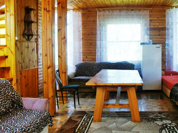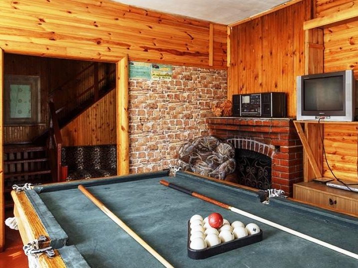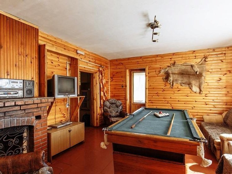На первом этаже коттеджа, в просторной комнате с камином, находится бильярдный стол, удобные мягкие диваны и кресла, музыкальная аппаратура. Здесь же расположен и банкетный зал. Его интерьер составляют массивные деревянные столы и лавы, покрытые янтарным лаком. Рядом просторная кухня с холодильником и необходимой посудой.