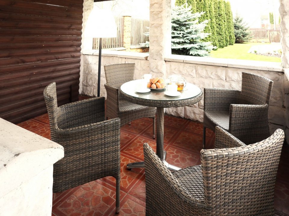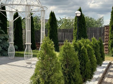 На территории зона барбекю с беседкой, качели, шезлонги.